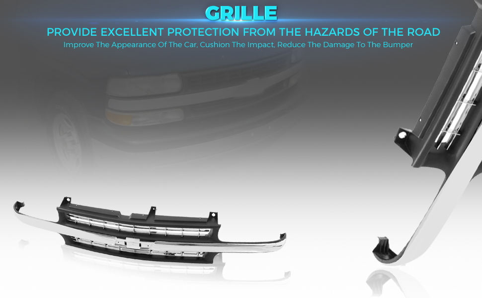 This front grille grill is a high-quality aftermarket OE replacement designed specifically for Chevrolet Silverado 1500/2500 (1999-2002) and Suburban/Tahoe (2000-2006) models. Featuring a durable chrome finish and bolt-on installation, it ensures a perfect factory fit and long-lasting style, making it the ultimate upgrade for truck enthusiasts seeking both performance and standout aesthetics.
