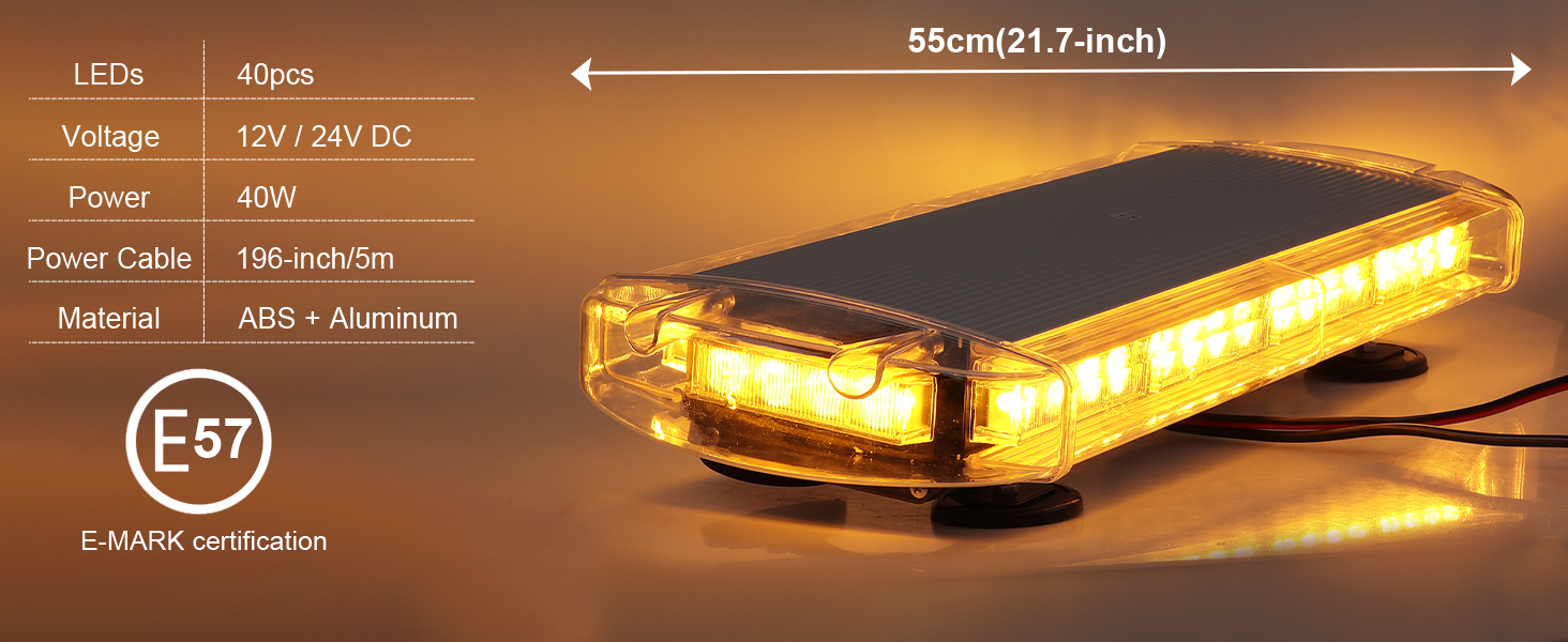 The Justech 40LED Car Emergency Bar delivers 40 high-intensity amber LEDs with 21 flash modes controlled via a digital switch featuring memory. Its strong magnetic base ensures quick, secure mounting on any metal surface, while the IP65 waterproof ABS and aluminum housing guarantees durability. Compatible with 12V and 24V vehicles, this 40W strobe light is engineered for emergency, construction, and security vehicles needing reliable, 360-degree warning visibility.