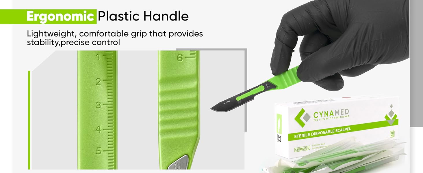 Cynamed Disposable Scalpel Blades are crafted from superior tempered stainless steel, ensuring sharpness and durability. Each pack contains 10 sterile scalpel knives, individually wrapped for hygiene, featuring a comfortable plastic handle with a built-in 6cm ruler for added convenience. Ideal for a variety of applications, from medical use to creative projects, these scalpels are designed for precision and safety.