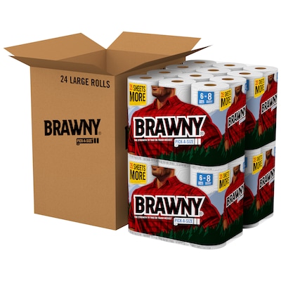 Description Keep messes to a minimum with this carton of 24 rolls of Brawny Pick-A-Size paper towels. Clean up liquids and other messes with this carton of 24 paper towel rolls. Each roll has 87 perforated sheets for choosing the correct size to fit the mess, and the two-ply construction holds more moisture than regular paper towels. These Brawny Pick-A-Size paper towels stay tough when wet for maximum durability. Kitchen roll towels are perfect for food preparation and cooking, cleaning kitchen counters and surfaces in the bathroom 80 sheets per roll, 24 rolls per carton (2088 sheets total) 2-ply thickness for absorbency and strength White sheets look clean and sanitary 100% virgin, no recycled content Meets or exceeds SFI standard Specifications Color Family : White Series or Collection : Pick-A-Size Brand : Brawny Quick Ship : Yes Customizable : No Weight : 1.00 lbs. per Carton