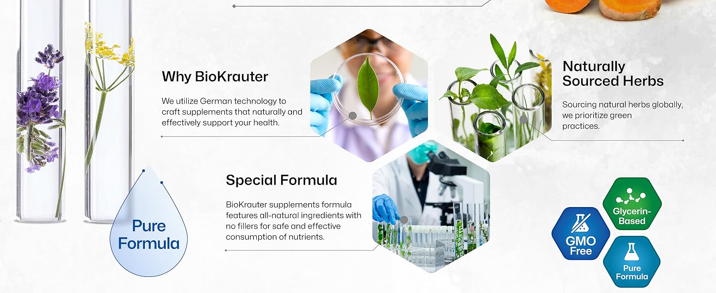 BIO KRAUTER Turmeric Supplement Tincture offers a potent 1200 mg dose of turmeric curcumin enhanced with black pepper extract for superior absorption. Crafted using advanced German technology, this vegan, alcohol- and sugar-free liquid formula ensures up to 98% bioavailability. Its glycerin base delivers a smooth, bitterness-free experience, making it an easy, effective addition to any health-conscious lifestyle.