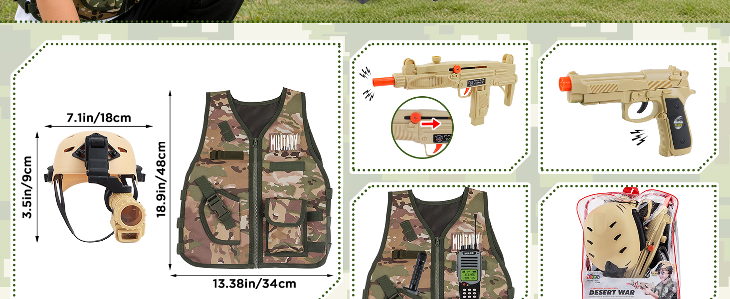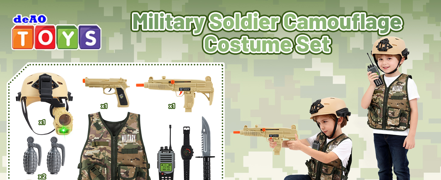 deAO Military Soldier Camouflage Desert War Costume Set with Helmet, Toy Shotgun, Grenades, Accessories, and Storage Backpack, Army Roly Play Toys, Washable Soldier Dress- Great Gift for Kids