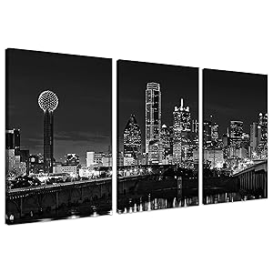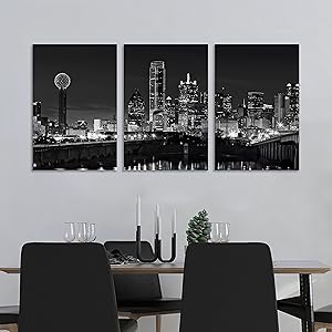 NAN Wind3 Pcs Wall Art Dallas Skyline Black & White Canvas Art Paintings For Room Decor Dallas Cityscape Skyscrapers Night Scene Picture Prints On Canvas For Home Decor Modern Giclee Framed