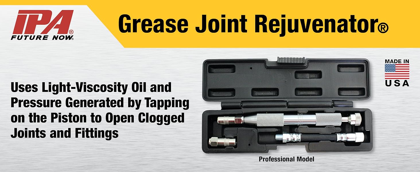 The Innovative Products of America 7862 Grease Joint Rejuvenator Kit is a professional-grade tool designed to flush out hardened grease from shafts, bushings, and joints in under a minute. It uses light oil injection to dissolve old grease, enabling fresh lubrication to flow freely. Packaged in a compact plastic case, this kit is essential for efficient maintenance and prolonging equipment life.