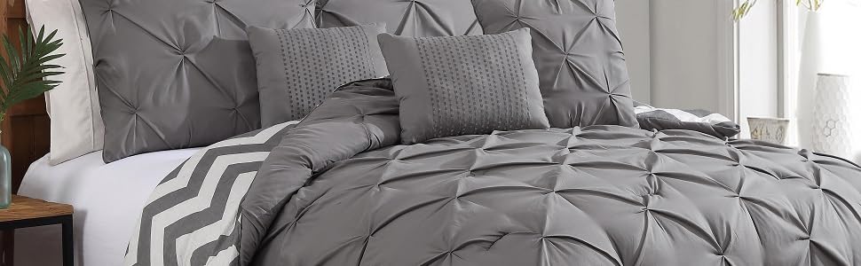 Avondale Manor 7-Piece Ella Comforter Bed Set - Reversible Ultra-Soft Pinch Pleat Grey Bedding Comforter Set with 3 Decorative Pillows for Queen Bed, Hypoallergenic, 7 Pieces, Queen Grey