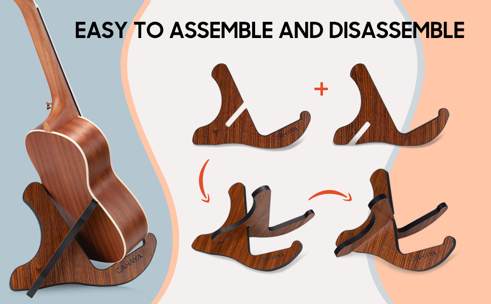 The stand arrived without assembly instructions, but it was obvious how to fit the two pieces together. It's subjective, but I think the stand looks good, and the grippy tape means the stand and the instrument stay put without causing any scratching.As you can see in the photos, this was bought for a Yamaha Guitalele (basically a 6-stringed ukelele) which presumably has the same body size as a ukelele.