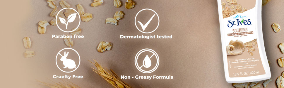 This 400ml body lotion combines 100% natural oatmeal and shea butter extracts in a paraben-free, non-greasy formula that absorbs instantly to moisturize and soothe all skin types, delivering smooth, healthy, and glowing skin with every use.