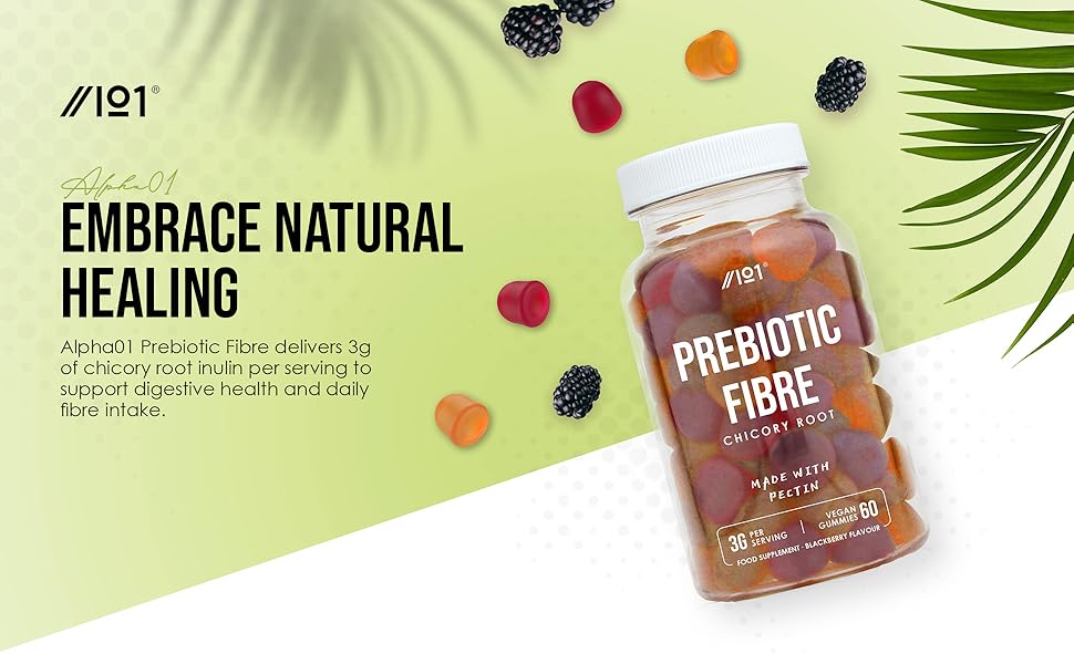 Alpha01 Prebiotic Fibre Gummies deliver 3 grams of chicory root inulin per serving in a delicious vegan gummy format. Designed to support digestive health and regularity, these 60-count gummies combine natural fruit flavours with clean, allergen-free ingredients sourced and certified in the EU for a premium, guilt-free daily fibre boost.