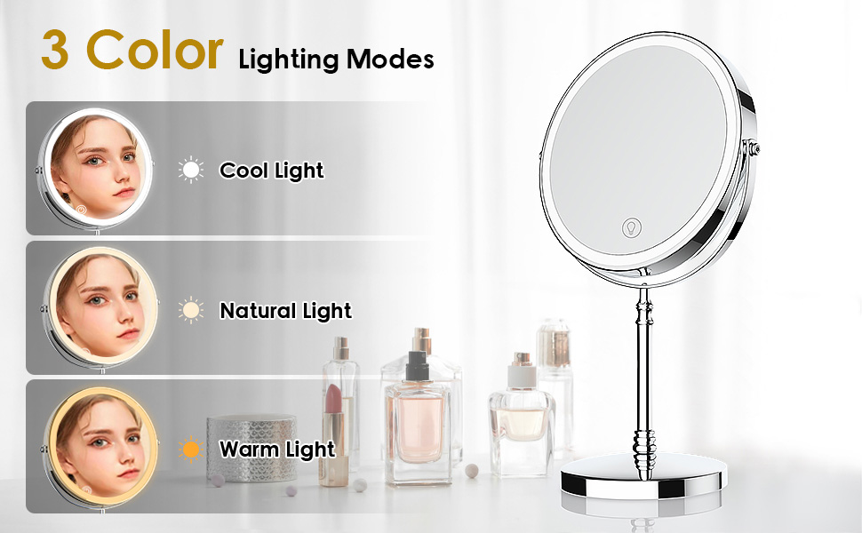 Very good product that has two types of mirror (magnifying and normal) the light has 3 settings, white bright, less bright and warm.The lightening feature really helps and when combined with the mirror gives a great vanity type experience.If you throw away the instructions before figuring out where the recharge slot is..... Save your self some effort and check the hinge where the mirror attach's to the frame!!!