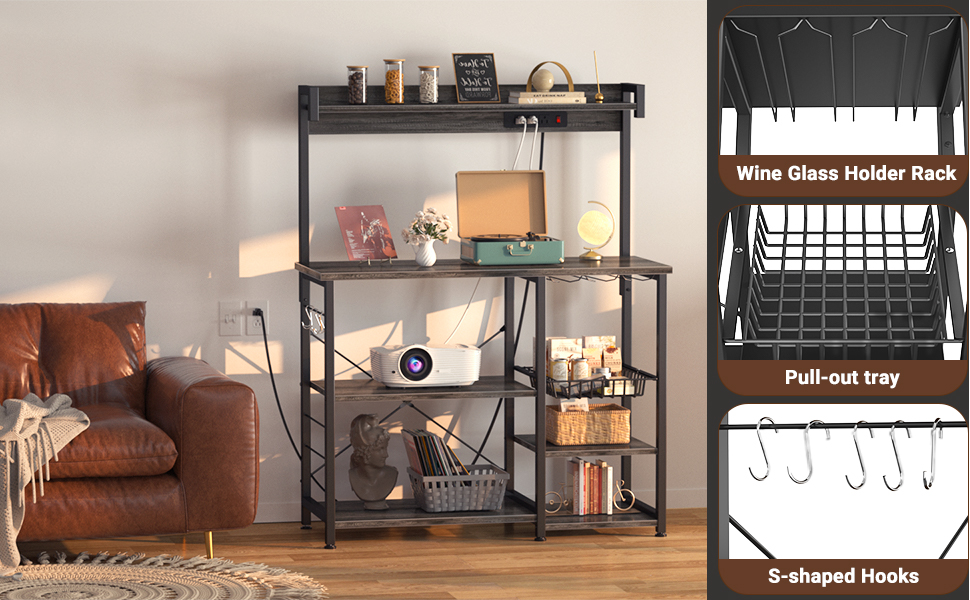 The Topfurny Bakers Rack is a multifunctional kitchen storage solution featuring 3 power outlets, ample shelving, and a stylish design. With a sturdy construction that supports up to 200lbs, it includes hooks for utensils, a wire basket for easy access to cutlery, and a dedicated wine glass holder, making it perfect for any modern kitchen.