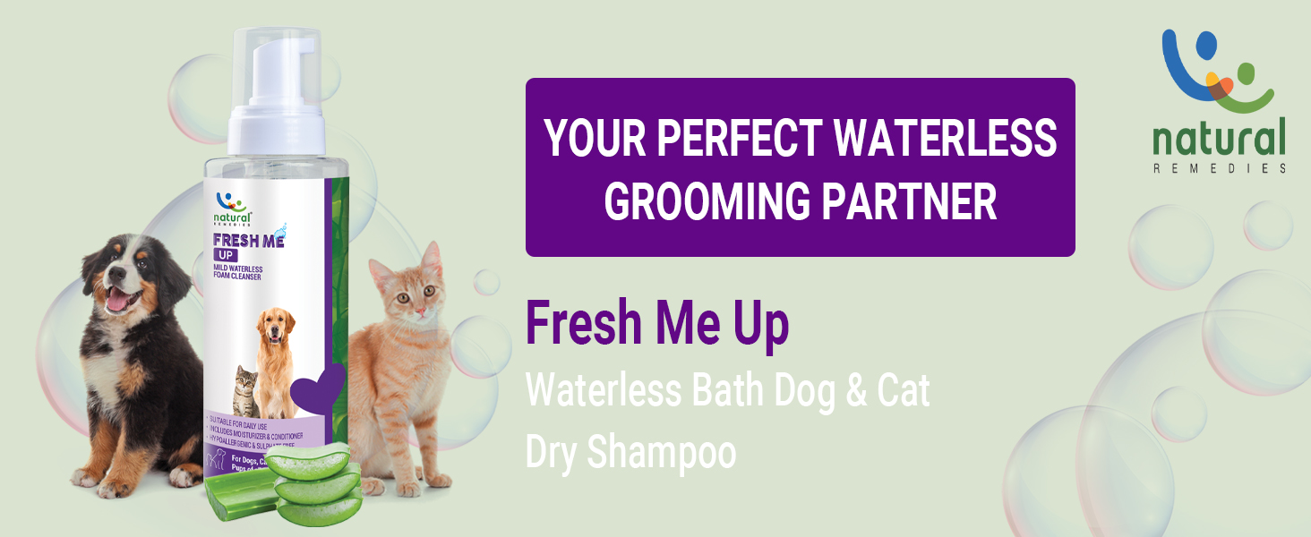 Fresh Me Up is a mild waterless foam cleanser for Dogs, Cats & Pups of all Breeds. It can be used for quick cleaning, deep cleaning & spot cleaning and is completely hassle free to use. Since Fresh Me Up is All Natural and Safe it is safe to use daily. It is not only Hypoallergenic, Sulphate free and Paraben free but also is specially pH balanced for Dogs, Cats, Puppies & Kittens. Experience Pet and Pet Parent friendly Range of products from Natural Remedies. Our products are not only safe and effective for pets but also convenient and hassle free to use for the pet parents as well.