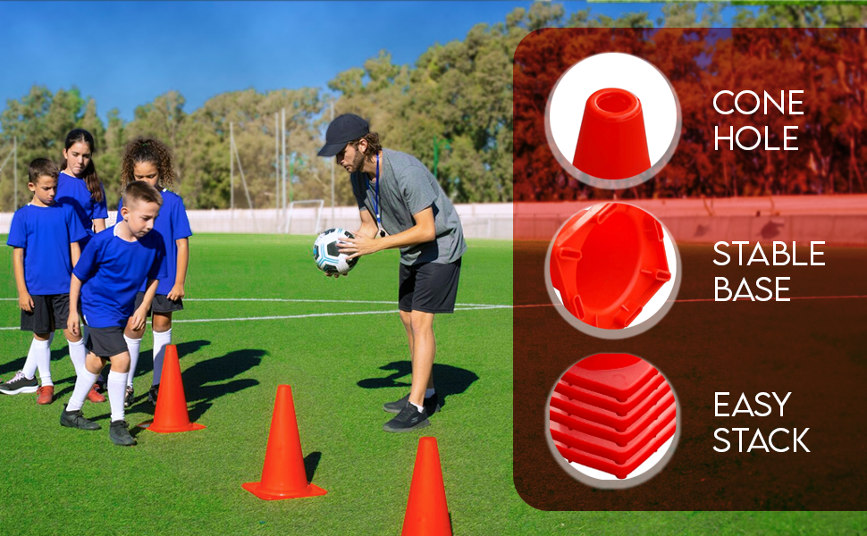 Versatyle’s heavy-duty agility training cones come in four sizes (6in, 9in, 12in, 28in) crafted from durable PVC plastic. This bright orange, lightweight, and stackable 12-cone set is designed for versatile use across sports, traffic, and vehicle training, ensuring high visibility and easy portability for professional-grade practice sessions.