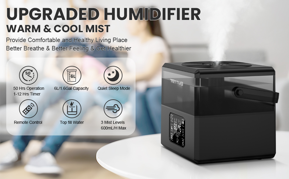 The Terrug 6L Humidifier is a versatile air humidifier and essential oil diffuser designed for large rooms up to 500 square feet. With a 6-liter capacity, it offers up to 50 hours of continuous mist, adjustable mist levels, and a convenient remote control. Its whisper-quiet operation and sleep mode make it perfect for bedrooms and nurseries, while the automatic shut-off feature ensures safety.