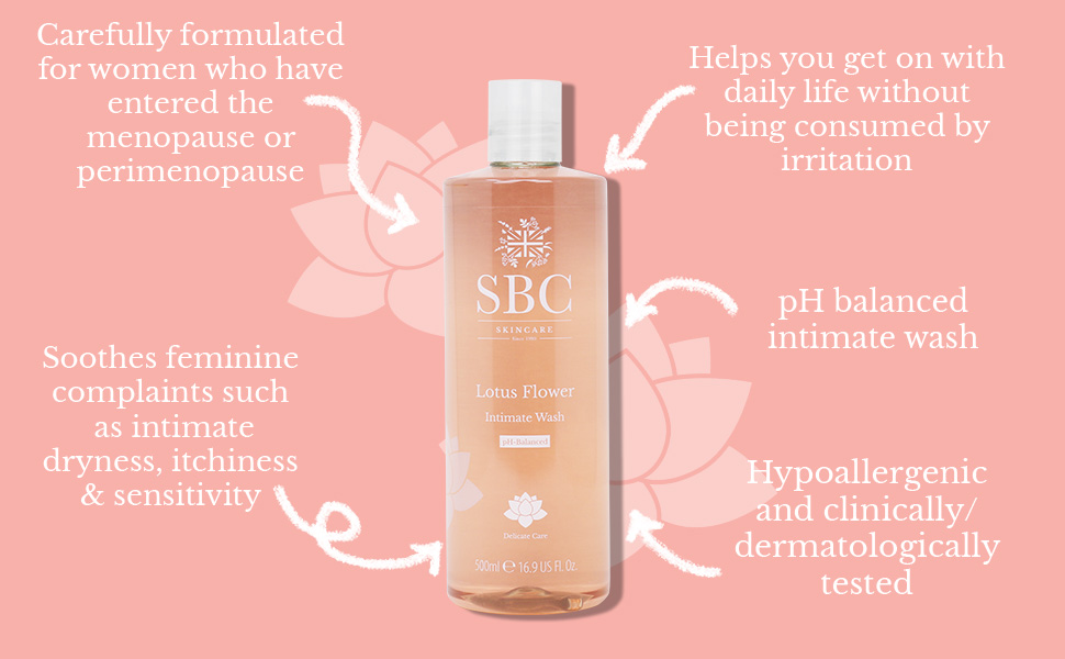 SBC Skincare Lotus Flower Intimate Wash is a 500ml vegan, soap-free gel designed to soothe dryness, irritation, and menopausal symptoms. Clinically tested and dermatologically approved, it balances pH and microflora while delivering a fresh jasmine scent, making it ideal for sensitive skin and women seeking gentle, effective feminine hygiene.
