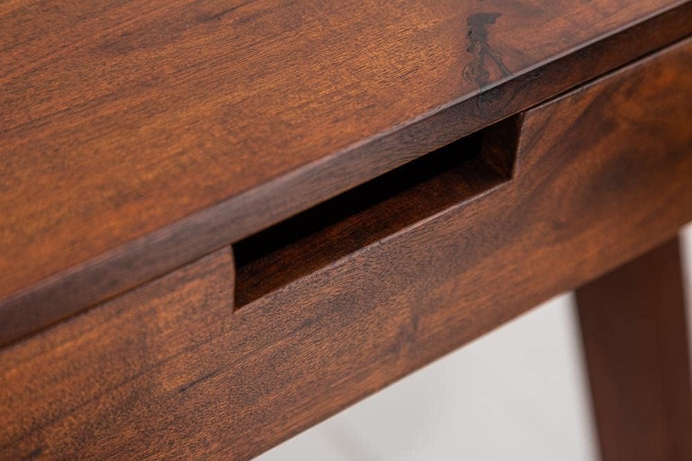 The HOMERANGE Wooden Writing Study Desk is a medium-sized, solid mango wood desk featuring a polished honey brown finish. It offers a large 1.29 x 2.9 meter tabletop, two pull-out drawers, and an open shelf for organized storage. Designed for adults and students, it fits seamlessly into home or office environments, combining durability with versatile style.