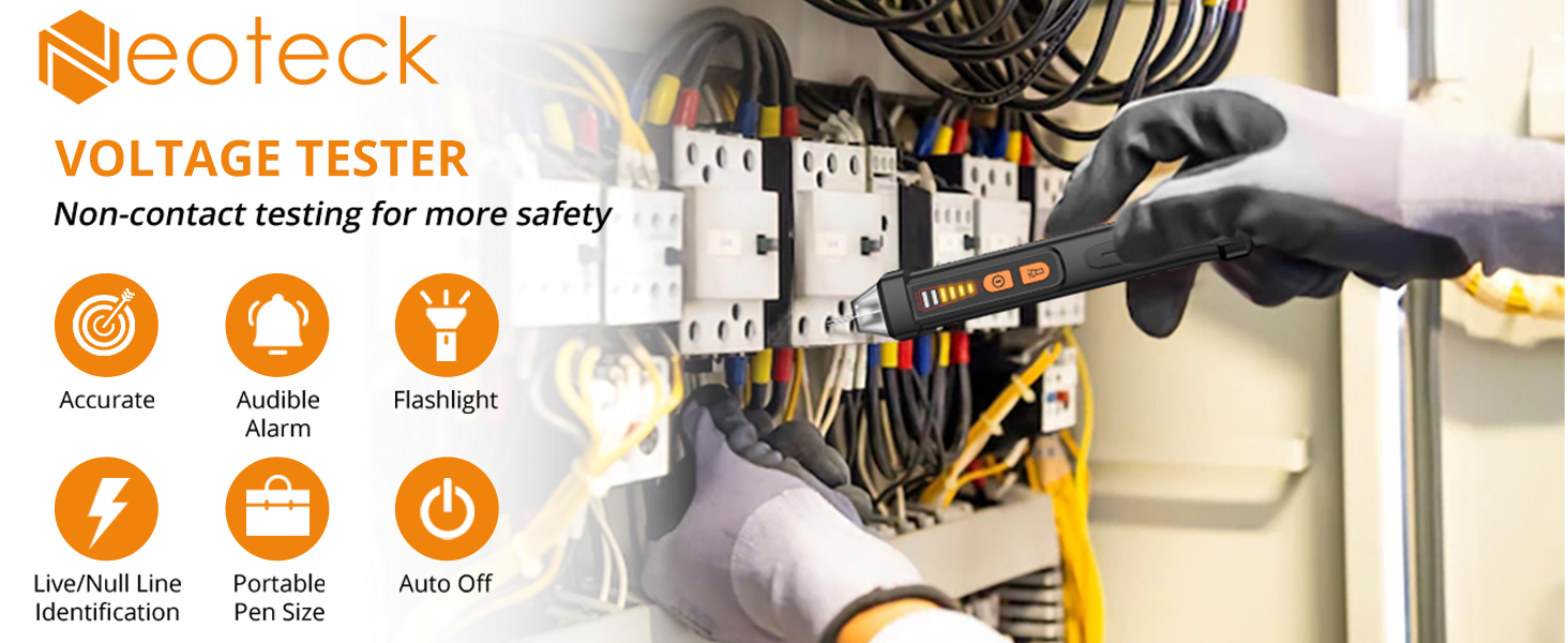 The Neoteck Non-Contact Voltage Tester NTK082US is a compact, battery-powered AC voltage detector with adjustable sensitivity from 12V to 1000V. Featuring a clear LCD display, buzzer alerts, and a built-in LED flashlight, it identifies live and null wires safely without contact. Certified to CE CAT III600V standards, it includes a breakpoint finder mode for quick fault detection, making it an essential tool for electricians, DIY enthusiasts, and homeowners seeking reliable, professional-grade electrical testing.