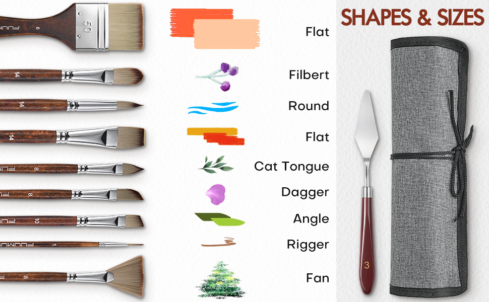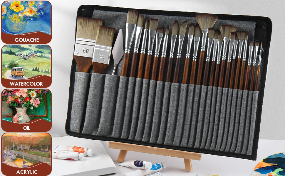 This 25-piece professional acrylic brush set features high-quality synthetic bristles engineered for smooth paint flow and durability. With 8 distinct brush shapes and sizes, ergonomic birch handles, and a stylish waterproof canvas roll for easy transport, it’s designed for artists who demand precision, comfort, and longevity in their tools.