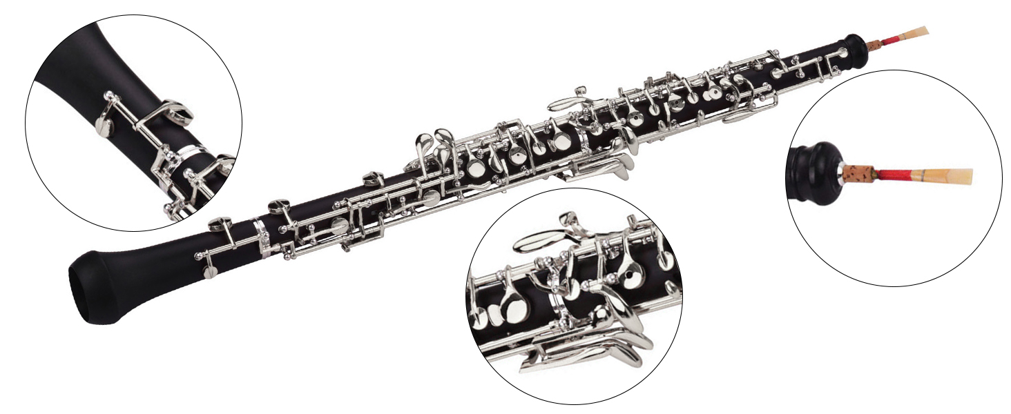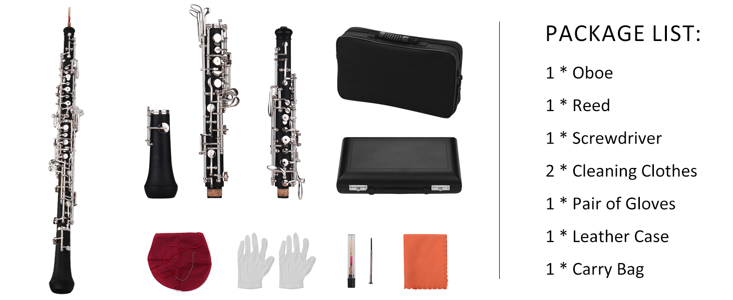 The Oboe Instrument Professional Oboe in C Key features a synthetic wood body and nickel-plated keys, designed for both beginners and professionals. It ensures easy assembly, exceptional sound quality, and comes with a convenient leather case and carry bag for portability.