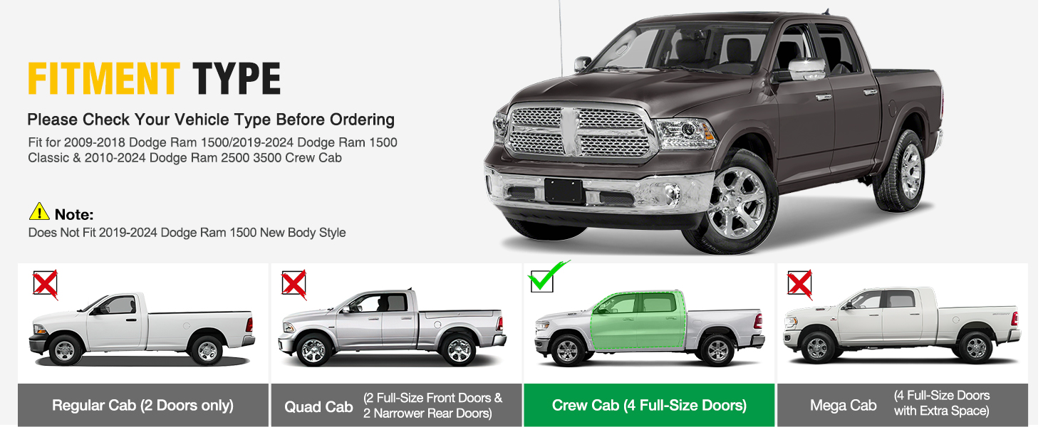 Nilight Running Boards are precision-fit stainless steel side steps designed for Dodge Ram 1500, 1500 Classic, 2500, and 3500 Crew Cab models (2009-2024). Featuring a durable one-piece construction with rust-resistant powder coating and 6-inch slip-proof ABS pads, these running boards support up to 450 lbs per step. Easy to install with no drilling required, they blend rugged durability with sleek style to elevate your truck’s functionality and curb appeal.