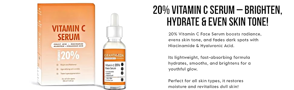 This Vitamin C Face Serum by Granthveda Professional features a potent 20% Vitamin C concentration combined with Niacinamide, Ferulic Acid, and Hyaluronic Acid to brighten, hydrate, and firm skin. Designed for all skin types, it offers antioxidant protection, reduces signs of aging, and improves skin texture with a clean, gentle formula free from parabens and sulfates.