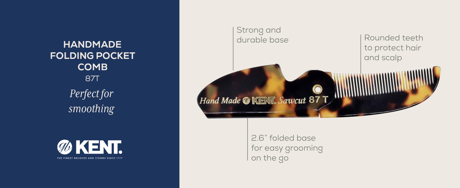 Kent87T TY Handmade Folding Pocket Comb for Men, Fine Tooth Hair Comb Straightener for Everyday Grooming Styling Hair, Beard or Mustache, Use Dry or with Balms, Saw Cut Hand Polished, Made in England