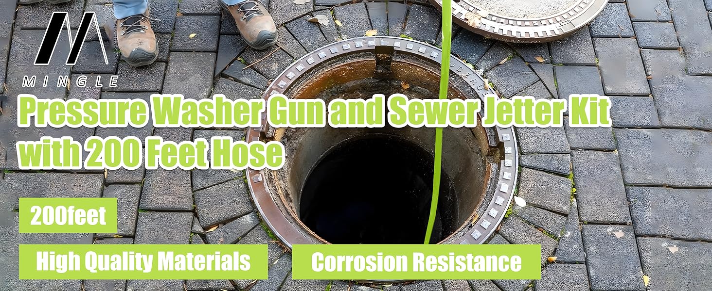 The M MINGLE Sewer Jetter Kit features a 200 ft high-pressure hose and a versatile set of nozzles—including rotating, button nose, and corner jets—designed to clear tough blockages efficiently. With a robust 3600 PSI working pressure and durable construction rated for 8000 PSI burst pressure and 140℉, this kit offers professional-grade sewer cleaning power and precision control via its ergonomic power washer gun. Ideal for both household and commercial drain maintenance, it ensures thorough, hassle-free pipe cleaning every time.