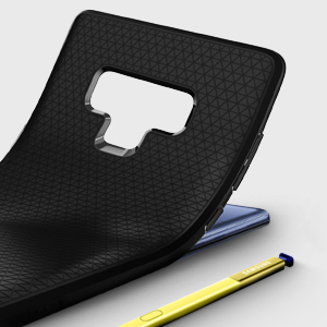 The Spigen Liquid Air Case for Galaxy Note 9 combines military-grade shock absorption with a slim, matte black design featuring geometric engravings for enhanced grip and fingerprint resistance, delivering durable protection without bulk.