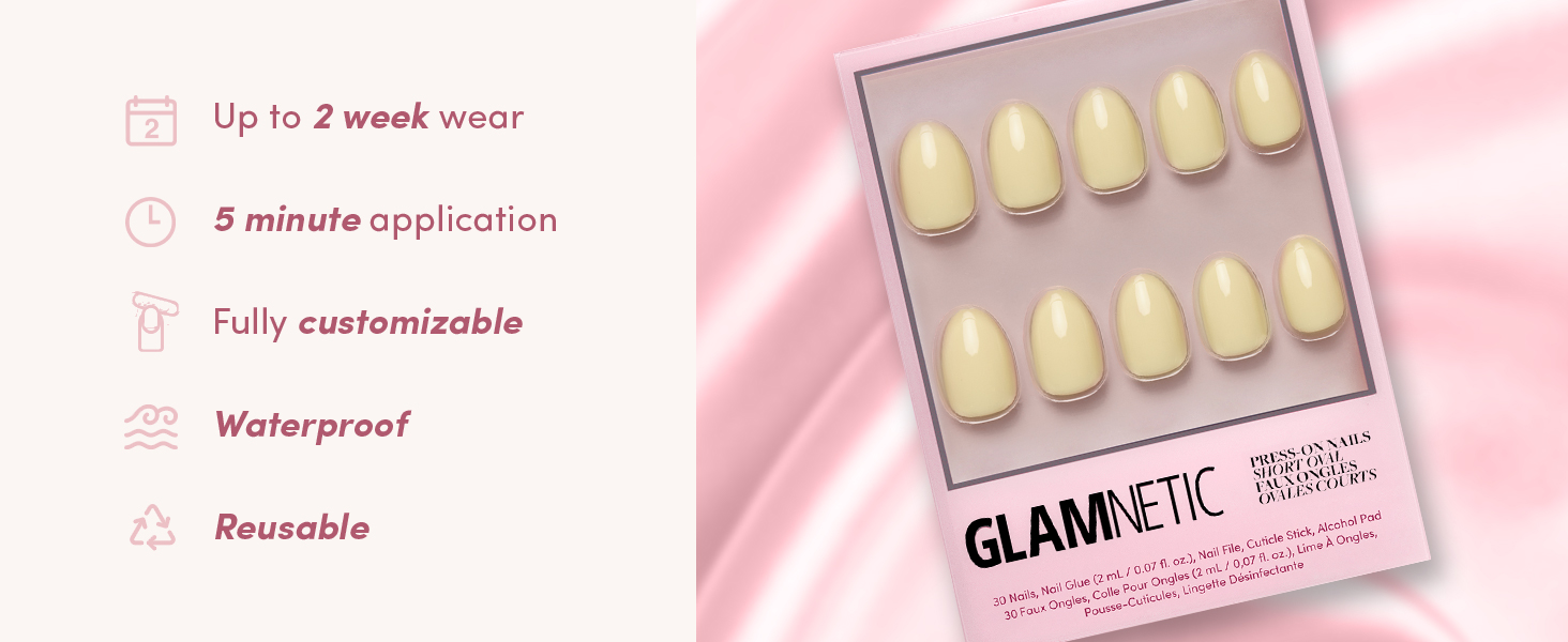 The Snap On Nails kit by Glamnetic offers 30 high-quality, pastel yellow oval false nails in 15 sizes, featuring a durable UV coating for shine and strength. Designed for easy application and removal, these reusable nails last up to two weeks per wear, perfect for busy professionals seeking a fresh, polished look with minimal effort.