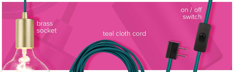 The Globe Electric 69997 Emile 1-Light Plug-in Pendant features a striking teal cloth cord measuring 15 feet for flexible placement, paired with a brass socket designed for E26 medium base bulbs up to 60W (bulbs sold separately). This pack of two pendants includes all mounting hardware for easy installation on flat, sloped, or vaulted ceilings, combining vintage-inspired customization with modern convenience and style.